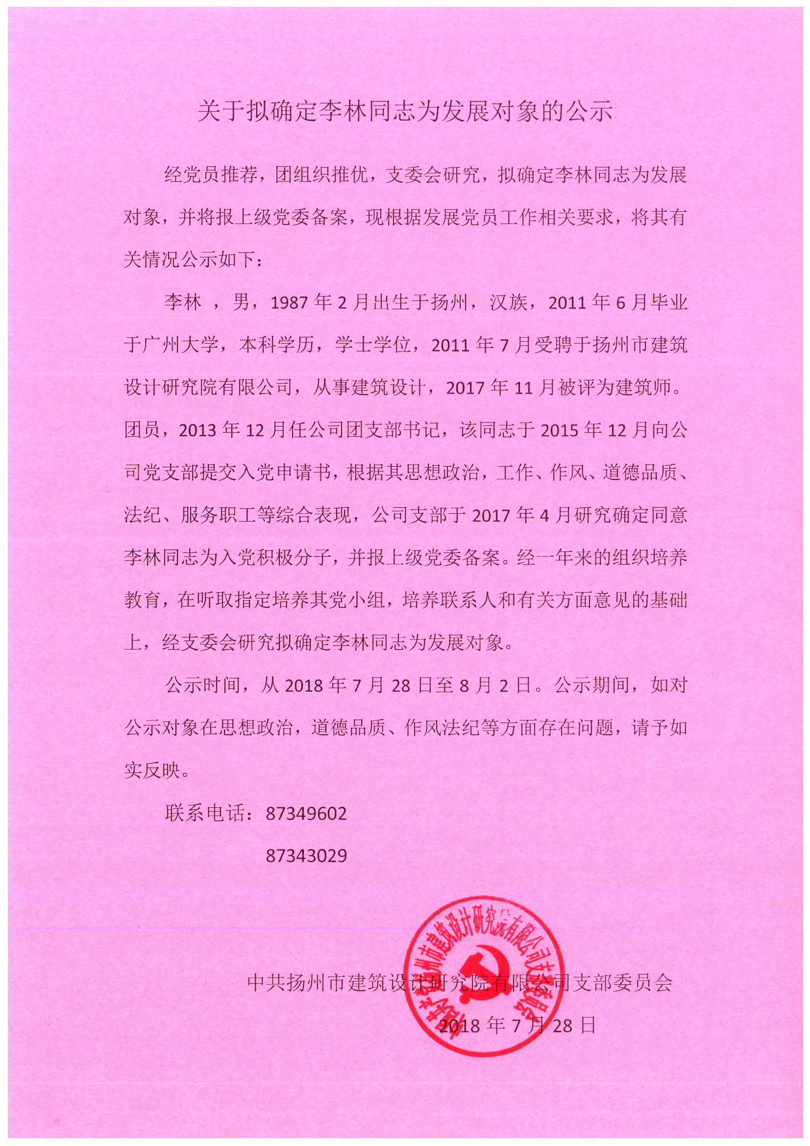 ·關于擬確定李林同志為發(fā)展對象的公示